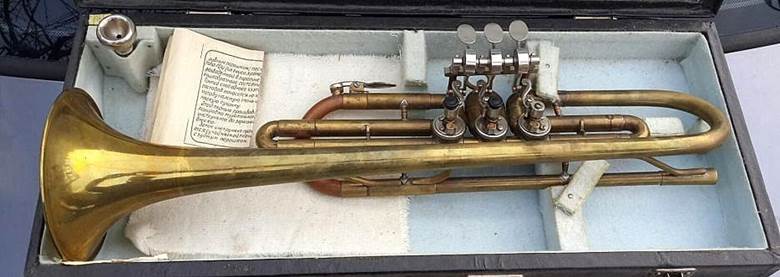 A Bohemian-made pea-shooter style trumpet by Bohland & Fuchs from just before World War II is below.