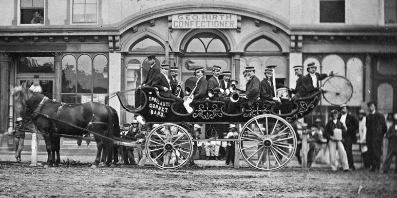 Berdan was both a fiddler of some fame, which is appropriate if not ironic given his middle name, and published a number of works for the genre. There is considerable mention of his involvement in dance events across several decades. At the same time, the Civil War bugler was an accomplished musician. When named as one of two judges for the Saginaw State Band Tournament of 1884, he was described as one of the foremost musicians of the period. His cornet playing extended to being a member for many years of the Ypsilanti Cornet Band, as pictured below in their unique carriage - appropriately for a town neighboring Ann Arbor, the home of the University of Michigan, purported to have been blue and gold. The band was led by Fred Cutler and Berdan is believed among the four in the front in this photo that, like the portrait at the top, comes from the collection of the Ypsilanti Historical Society.